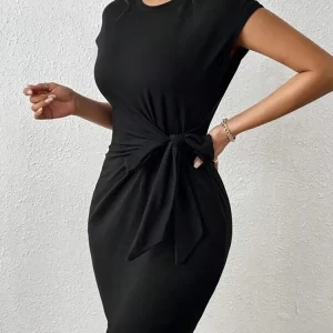 Women 2024 Fashion Round Neck Solid Texture Kintted Dress Lace-Up Waist Bow Decoration Tight Knit Simple Dress Cheap Sales
