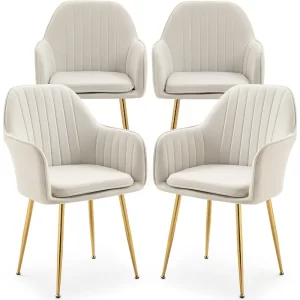 Modern Living Dining Room Accent Arm Chairs Set of 4,Velvet Mid-Century Upholstered Seat Club Guest with Golden Legs,Light Beige