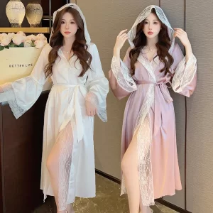 2023 Summer Long Sleeve Silk Satin Hooded Kimono Robes for Women Korean Cute Lace Bathrobe Sleepwear Homewear Night Dress Nighty