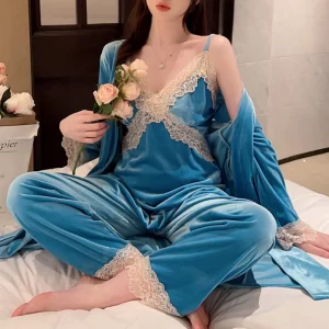 New Autumn Winter Velvet 3PCS Pajamas Set Sleepwear Sexy Lace Trim Women Kimono Bathrobe Gown Loose Casual Pijamas Suit Homewear