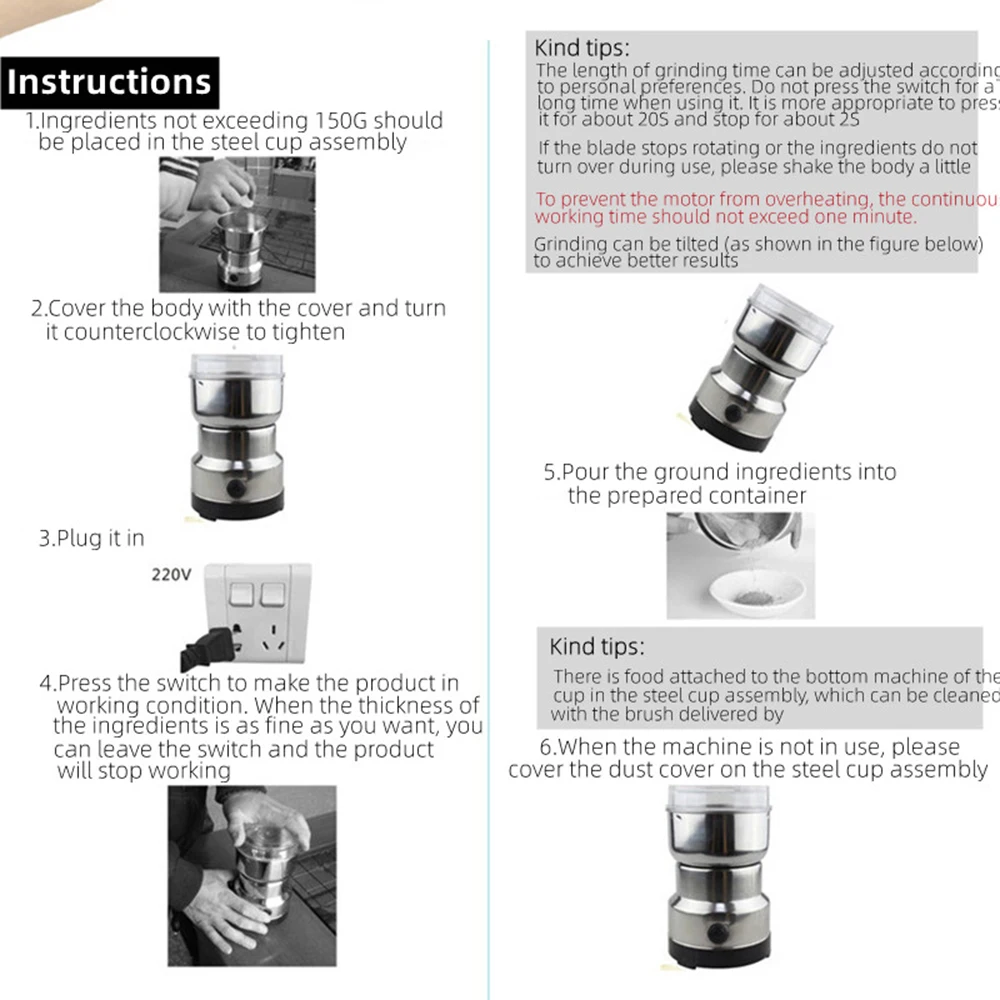 4.during use, press the button about 5 seconds to stop for 1 second, and then continue working. Repeat the operation several times until the ideal grinding degrees are reached.