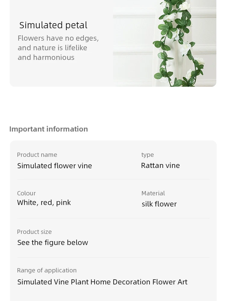 • Realistic Appearance :The artificial rose vine looks like real roses, making it a great alternative for those who don't have the time or resources to maintain real flowers.