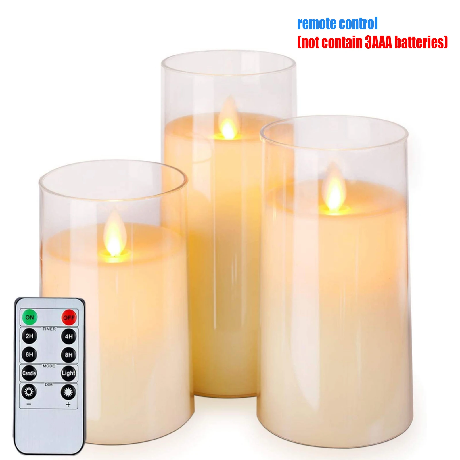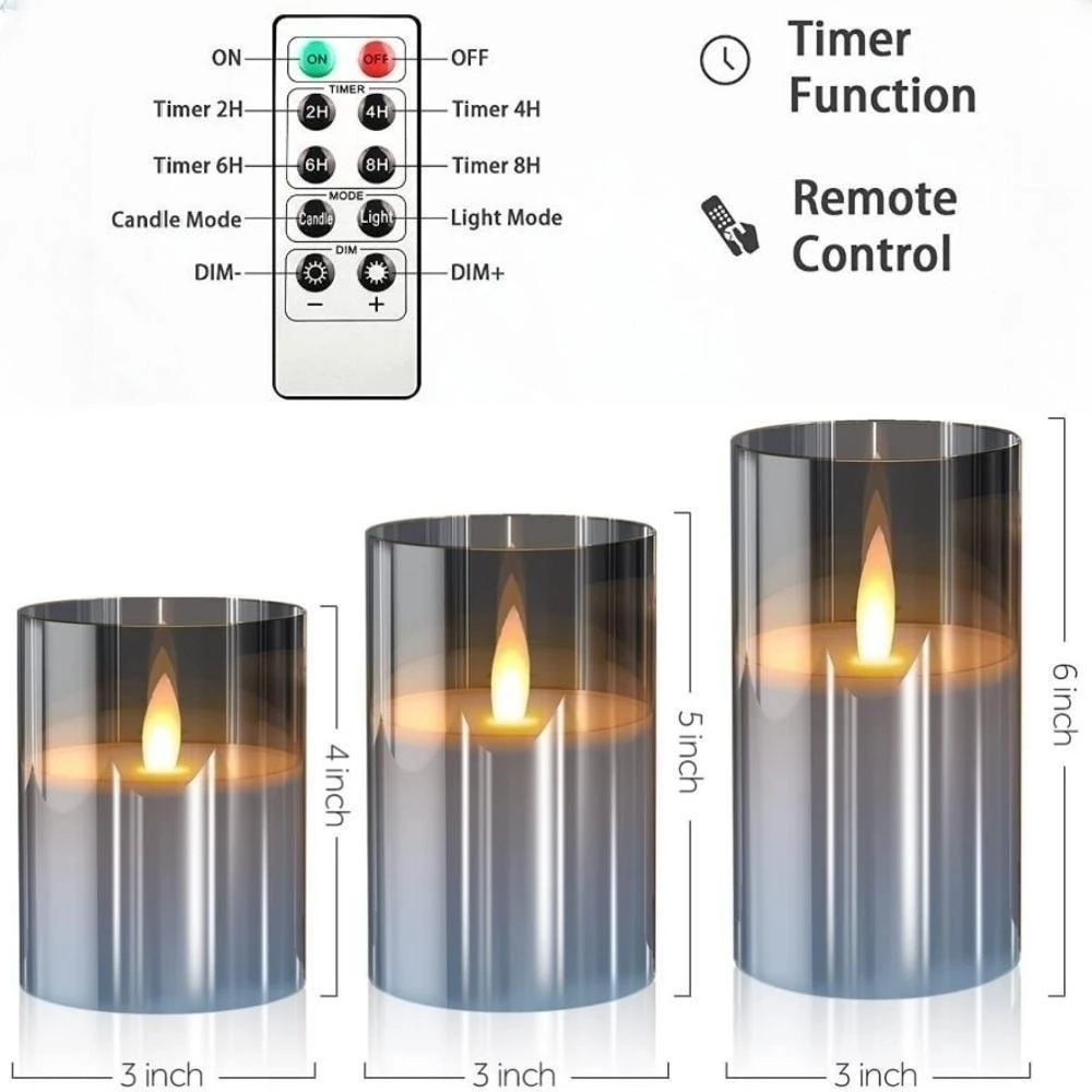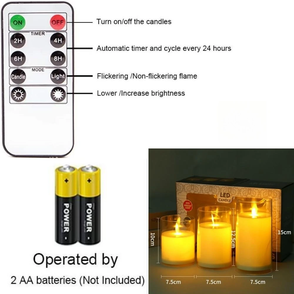 5.[Package Included] 3 LED Flameless Moving Candles (D: 3" x H: 4"/ 5"/ 6"), a 10-key remote with timer and a user manual. Powered by 3 AAA batterie.The product is not waterproof.
