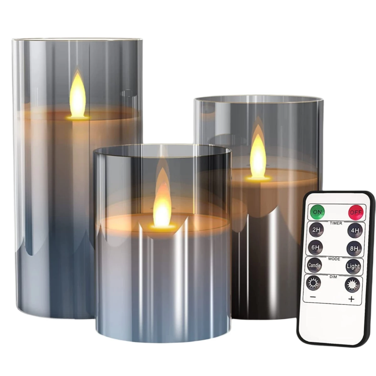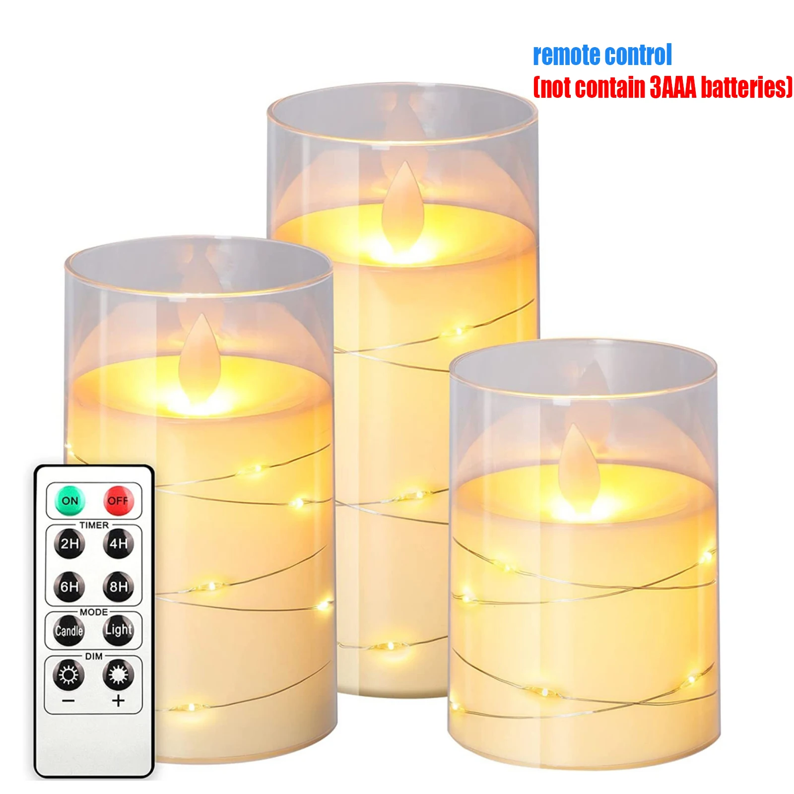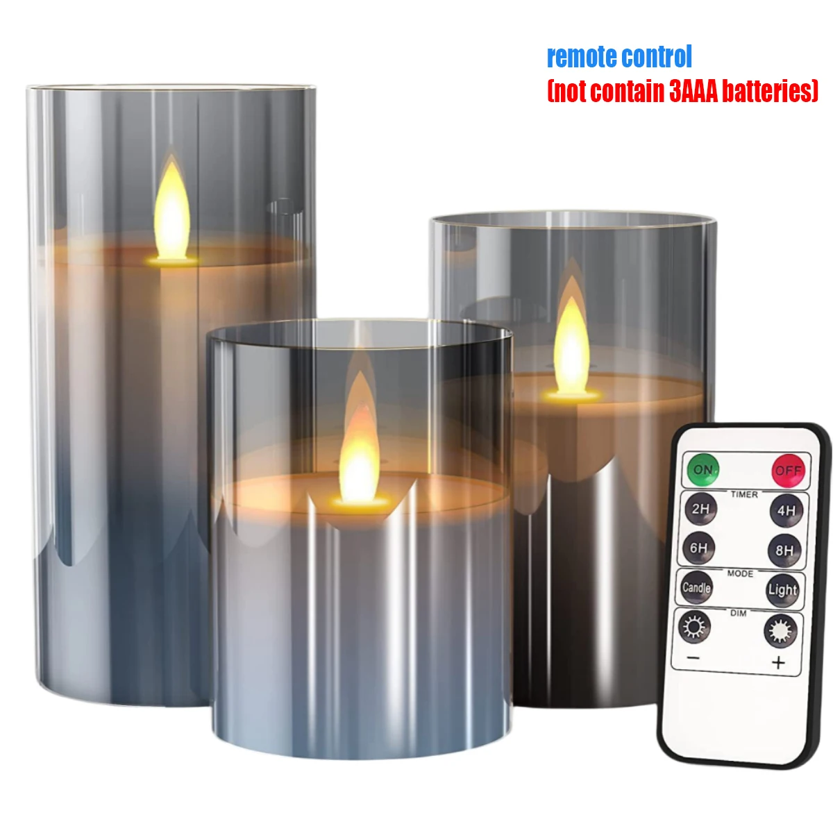 5.[Package Included] 3 LED Flameless Moving Candles (D: 3" x H: 4"/ 5"/ 6"), a 10-key remote with timer and a user manual. Powered by 3 AAA batterie.The product is not waterproof.