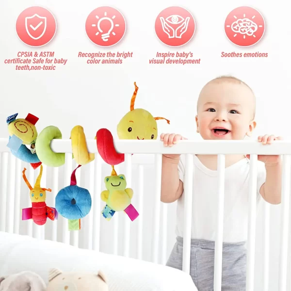 [Multi- Use] It’s easy to spiral the adorable toys on car seat mobile, baby carrier, bassinet stroller bar, crib rails, shopping cart handles, etc.