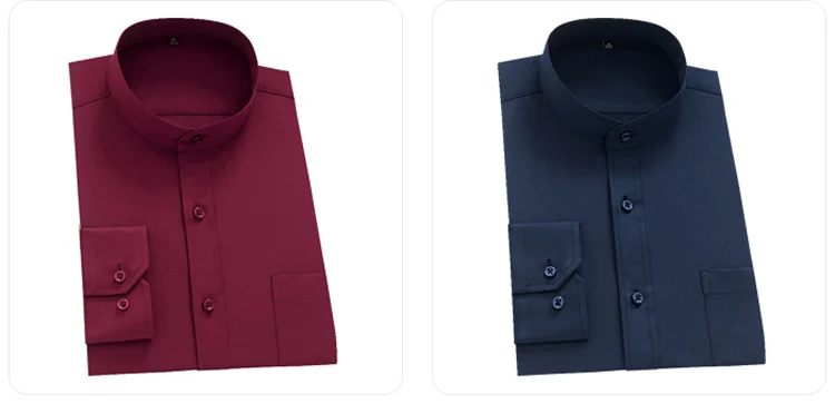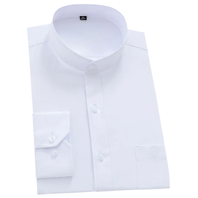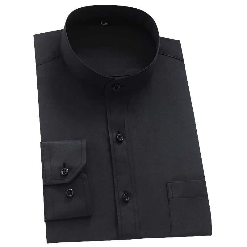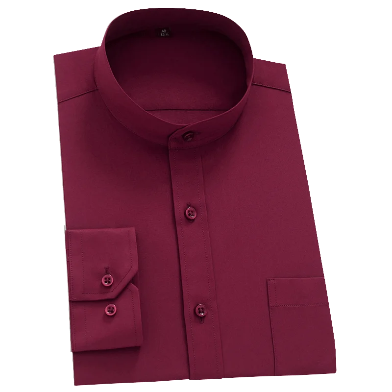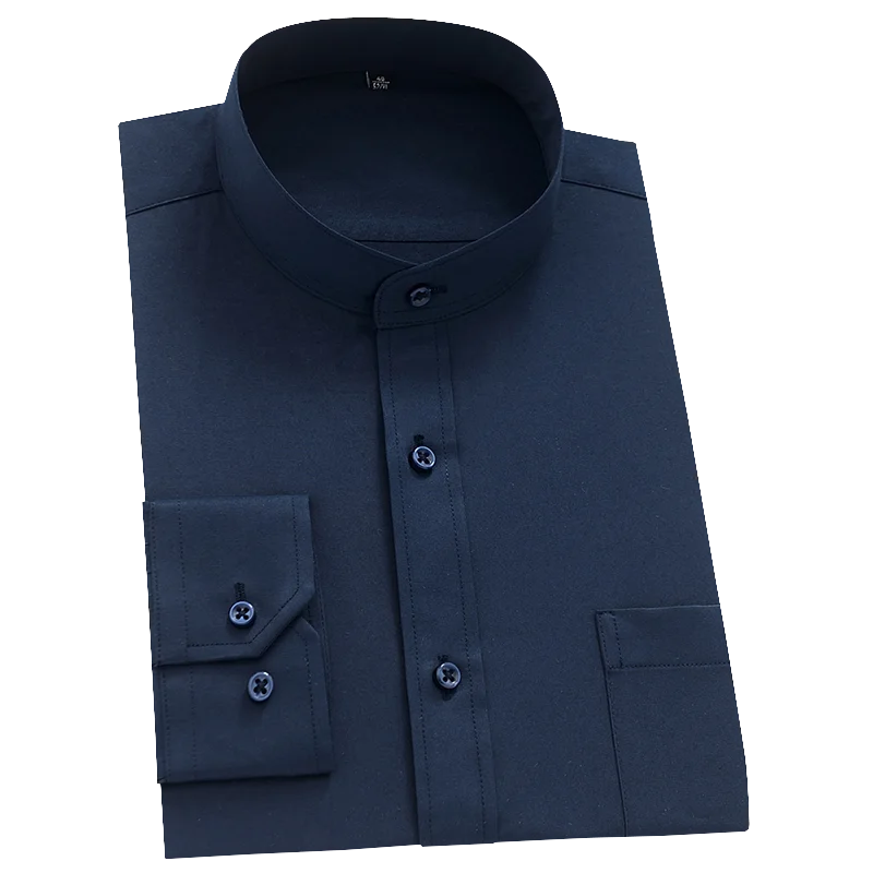 Classic Solid Men’s Semi-formal Long Sleeve Button Up Shirt With Stand Collar Single Patch Pocket Regular-fit Dress Shirts