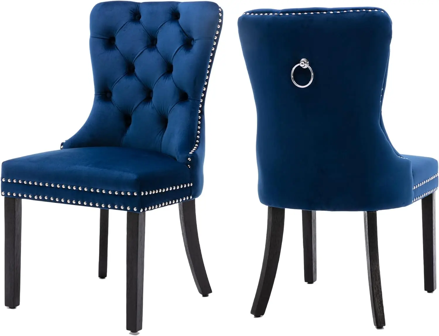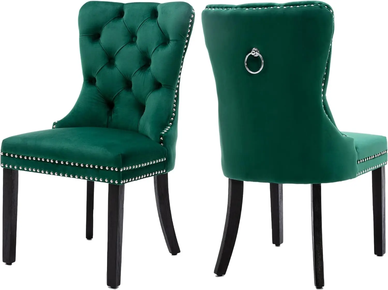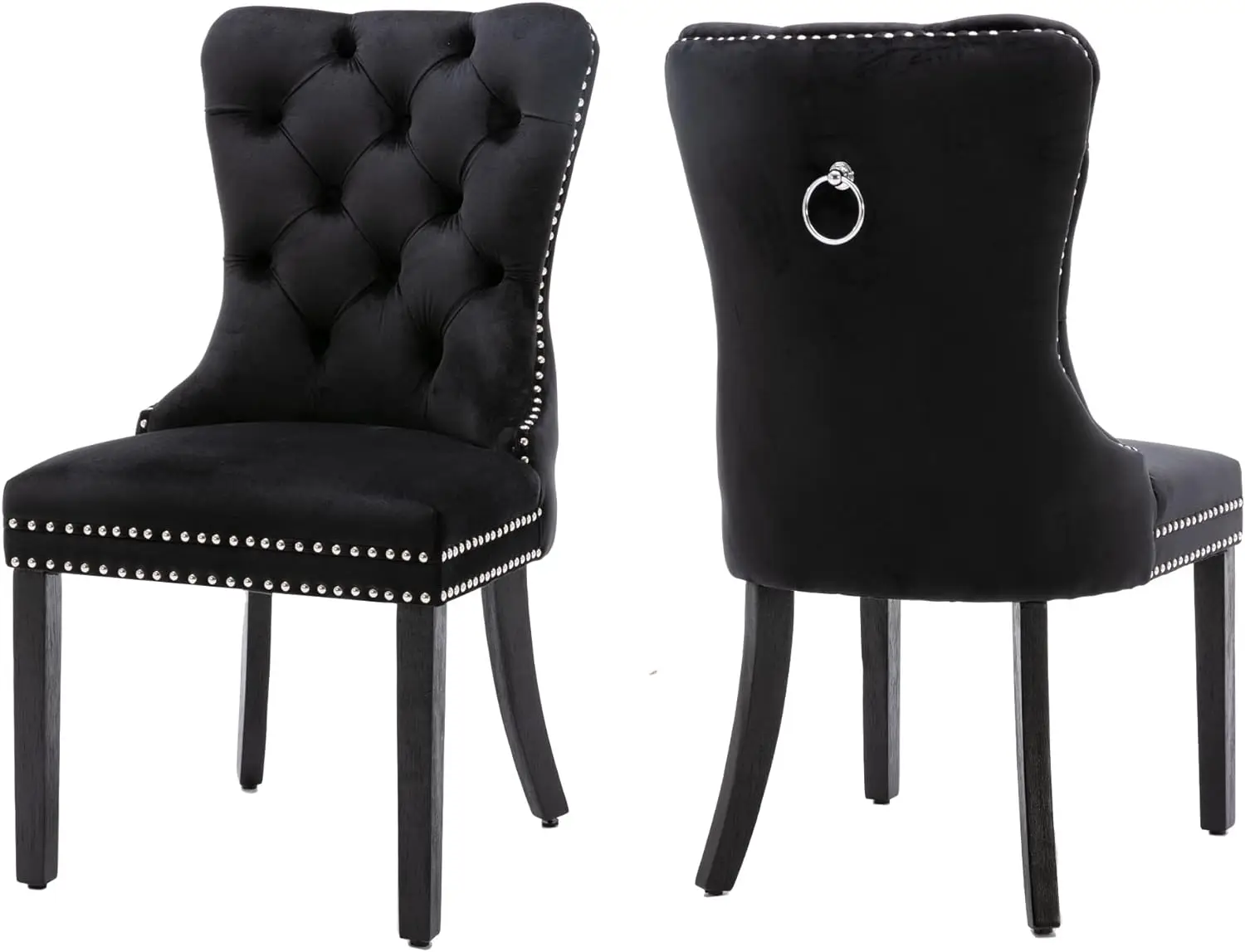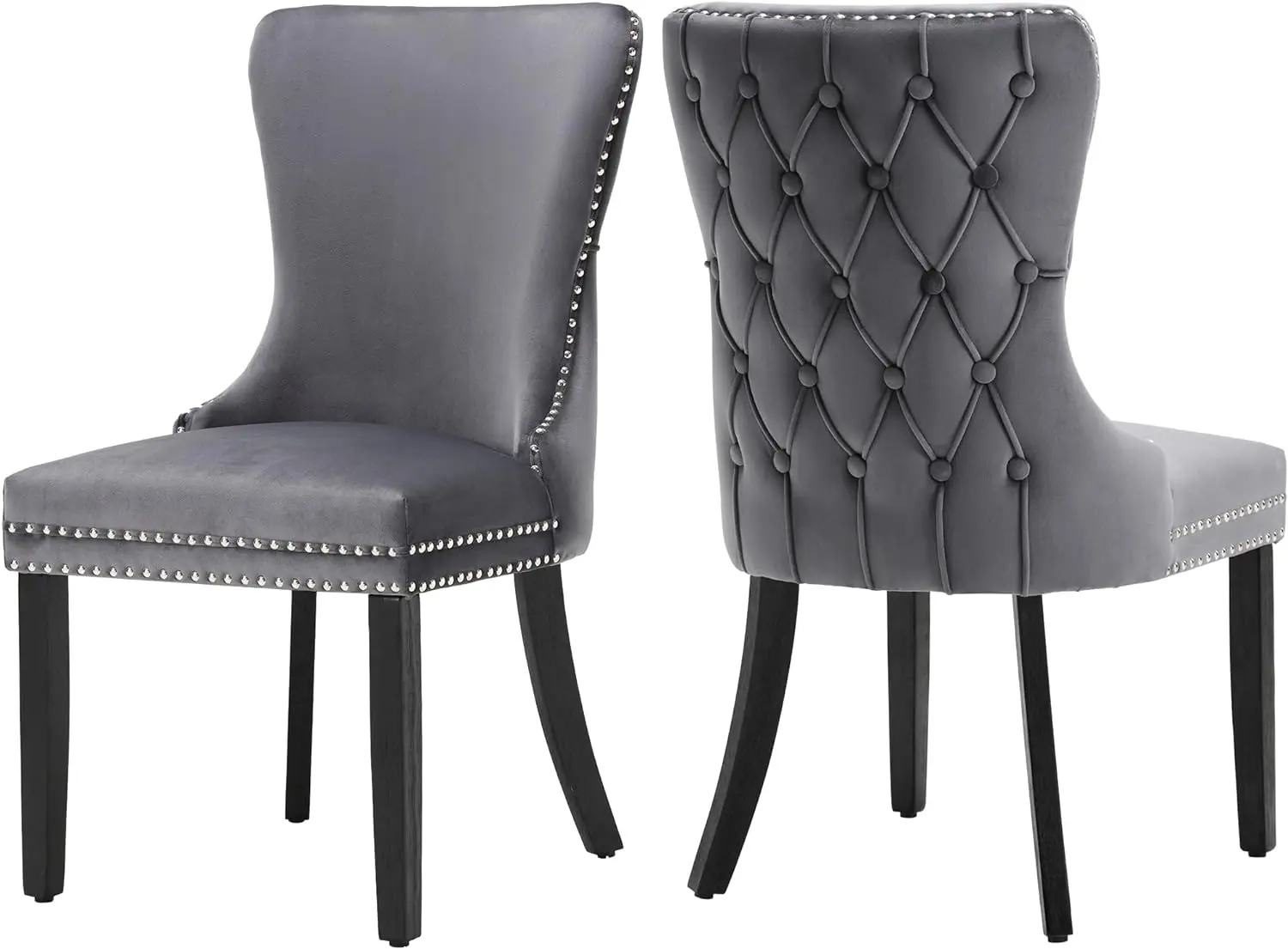 Upgrade your dining room decor with velvet dining chairs, featuring a stunning and noble appearance with button tufting and retro rivet trims along the edges of the seat and backrest.