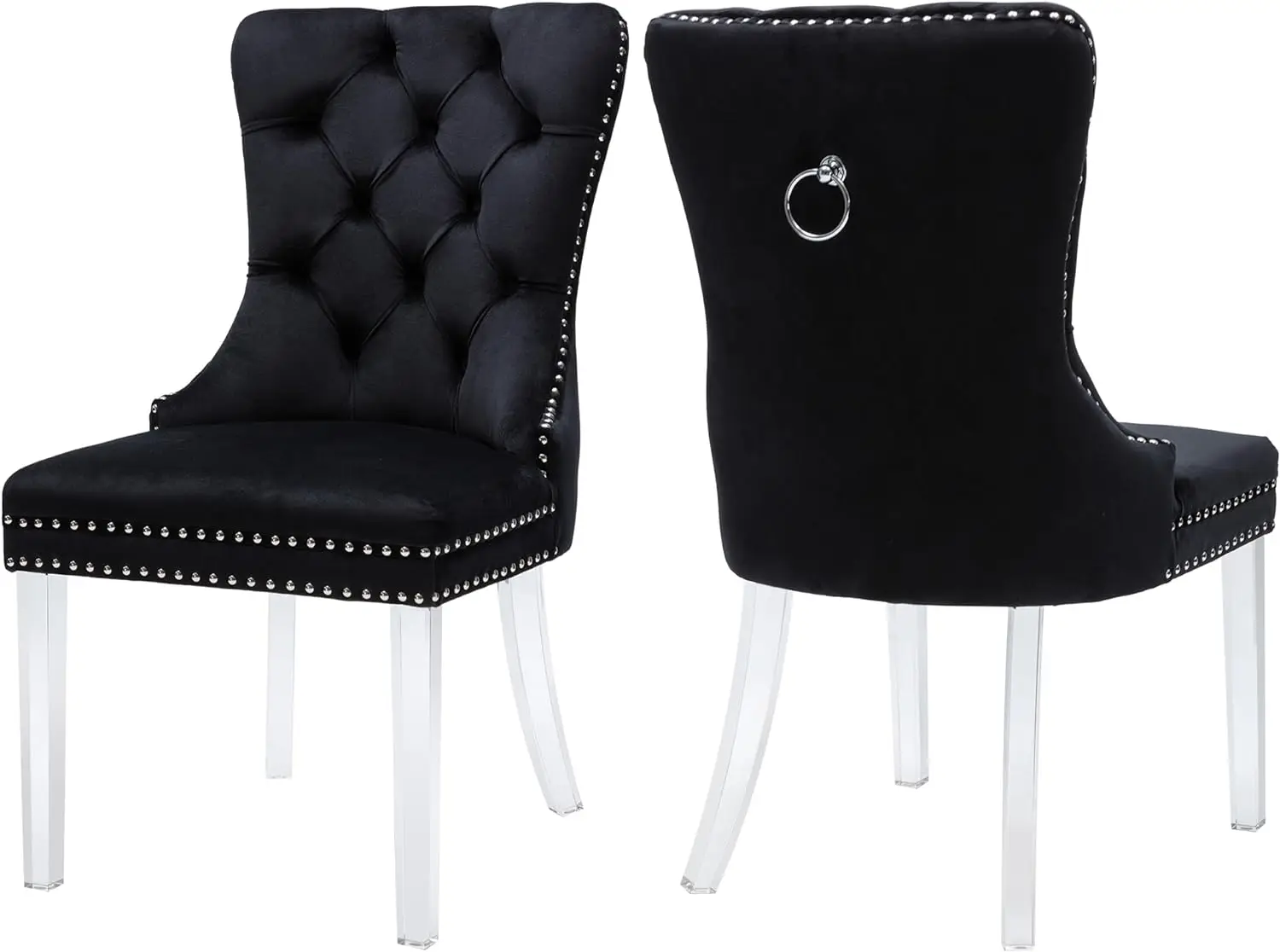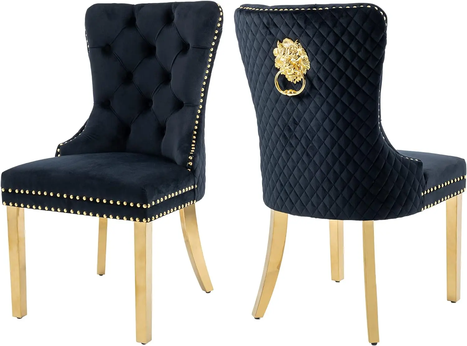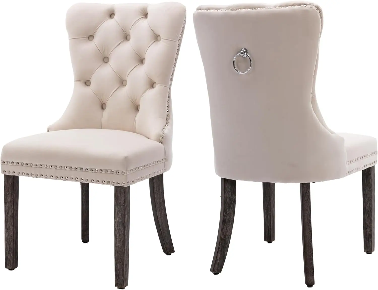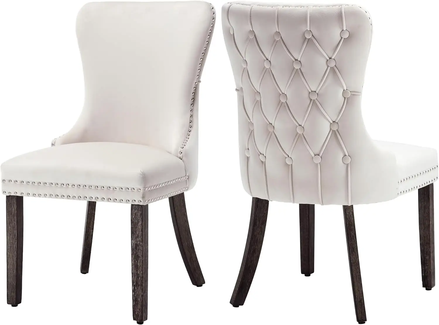 Upgrade your dining room decor with velvet dining chairs, featuring a stunning and noble appearance with button tufting and retro rivet trims along the edges of the seat and backrest.