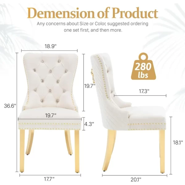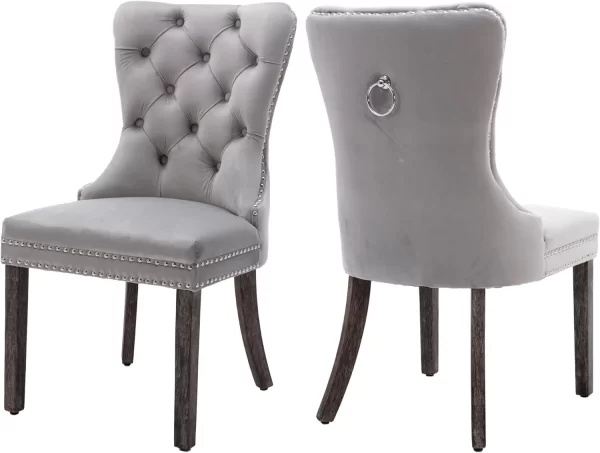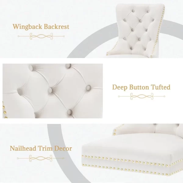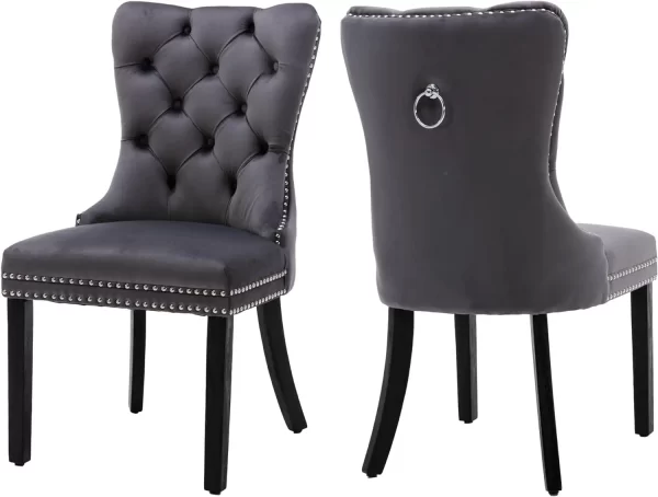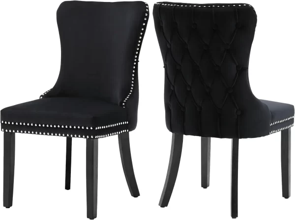 Upgrade your dining room decor with velvet dining chairs, featuring a stunning and noble appearance with button tufting and retro rivet trims along the edges of the seat and backrest.