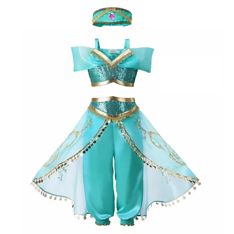 Disney Jasmine Princess Dress of Birthday Party Carnival Cosplay Aladdin Agic Lamp Girls Costume Vestidos Halloween Clothing Set