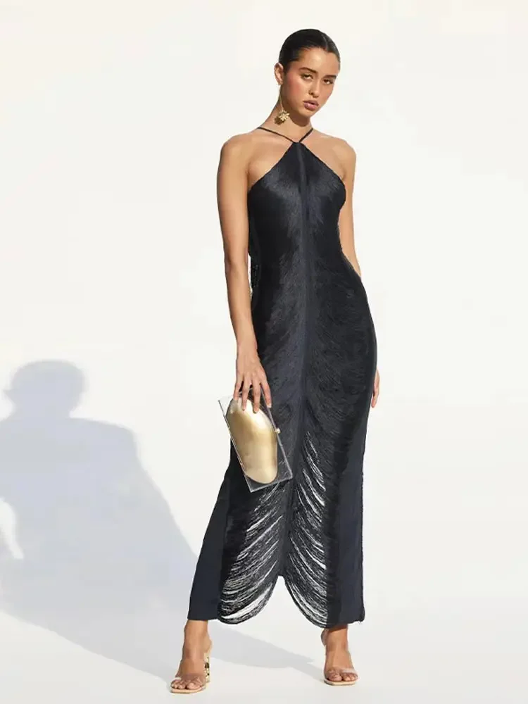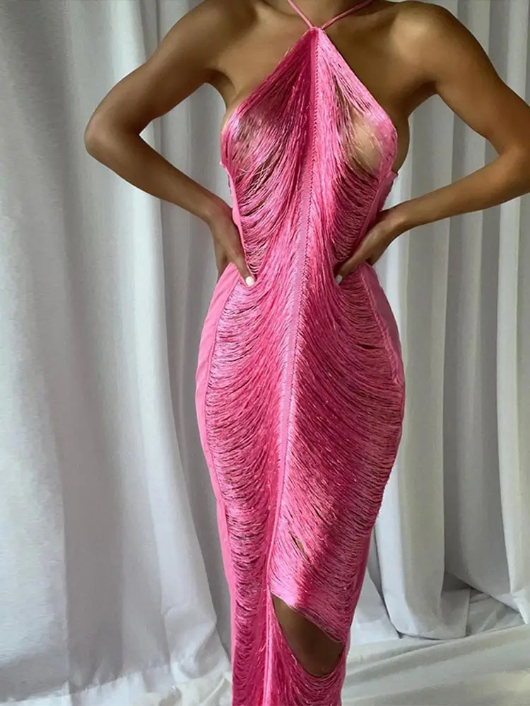 Model Number: Fashion Tassel Back Slit Halter Evening Dress Women