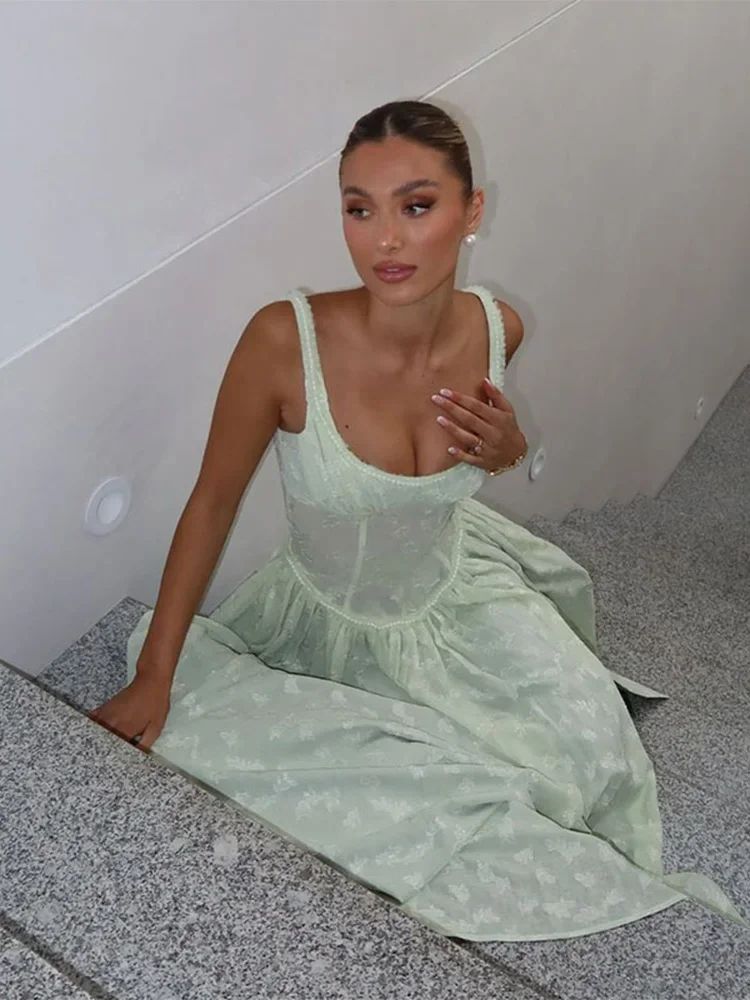 Model Number: Flower Printed Slim A-line Sling Green Dress