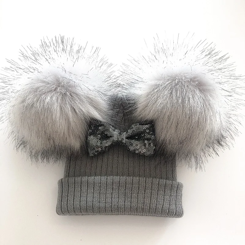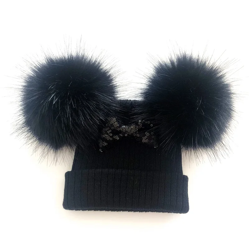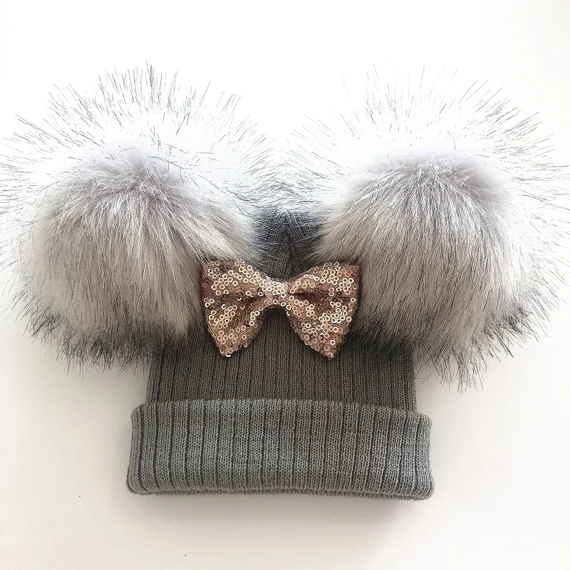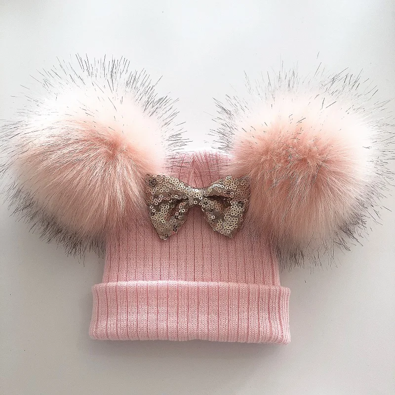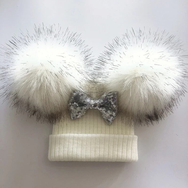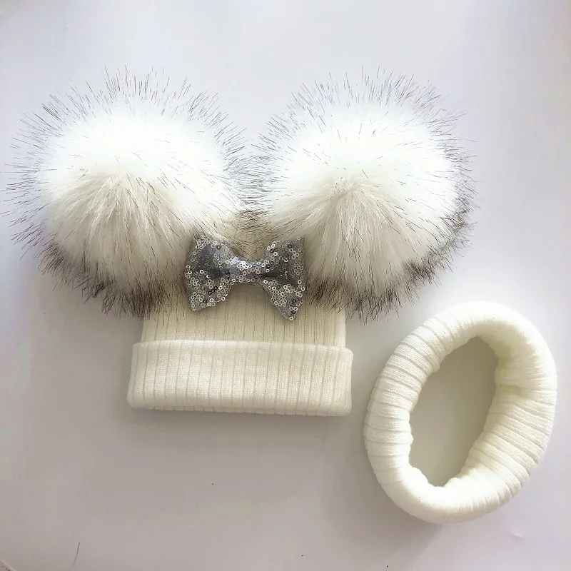 Kids Glitter Bow knot Double Pompom Hat For Baby Girls Winter Cap Scarf Children Accessories Bonnet
