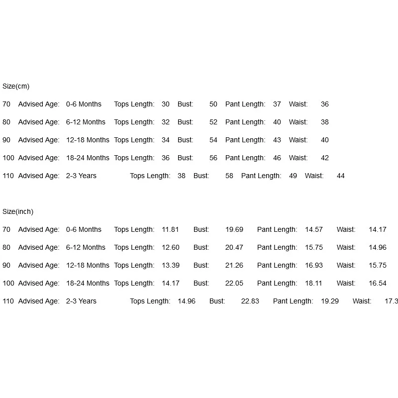 80   Advised Age:   6-12 Months   Tops Length:   12.60    Bust:   20.47    Pant Length:   15.75    Waist:   14.96