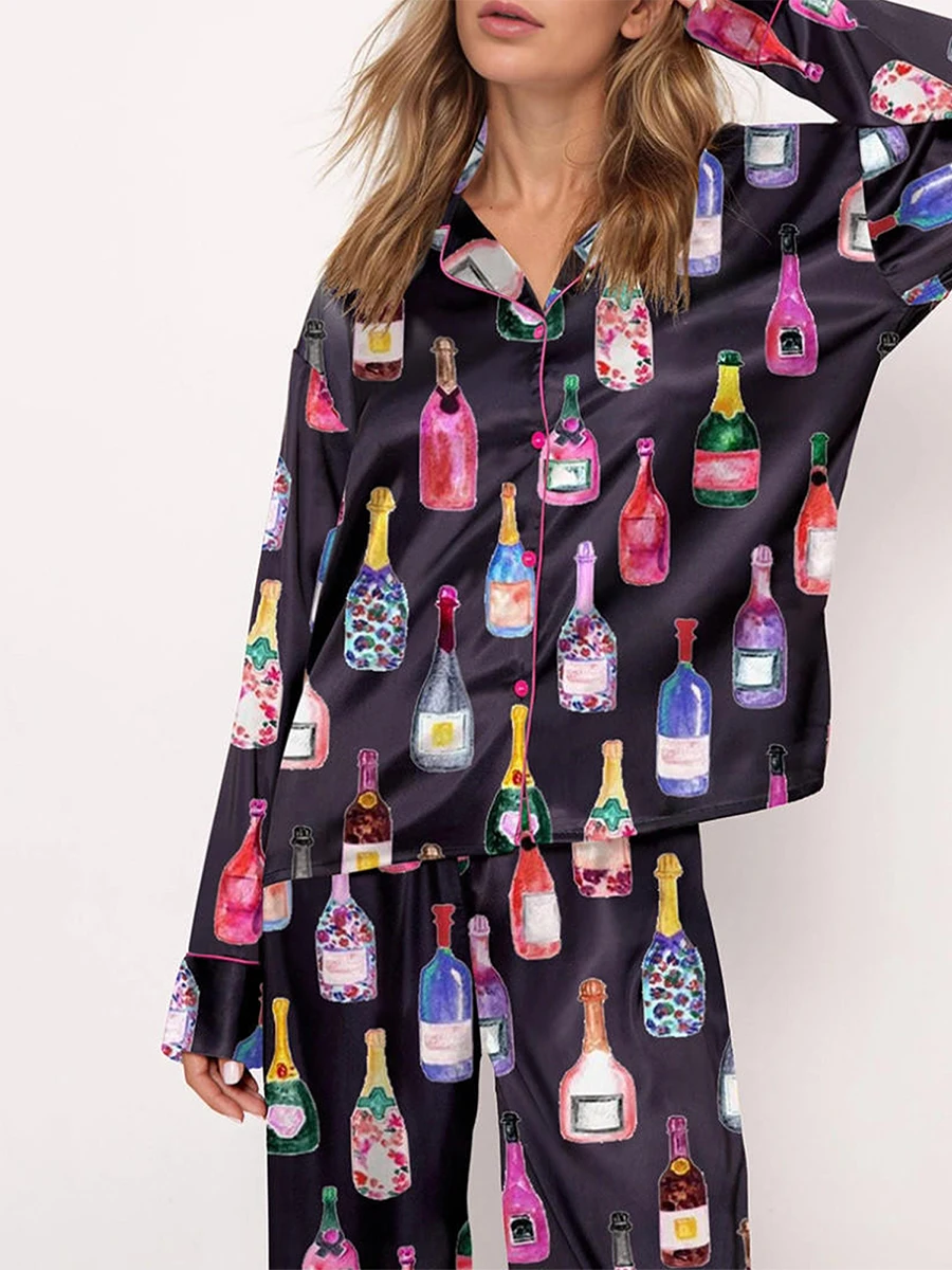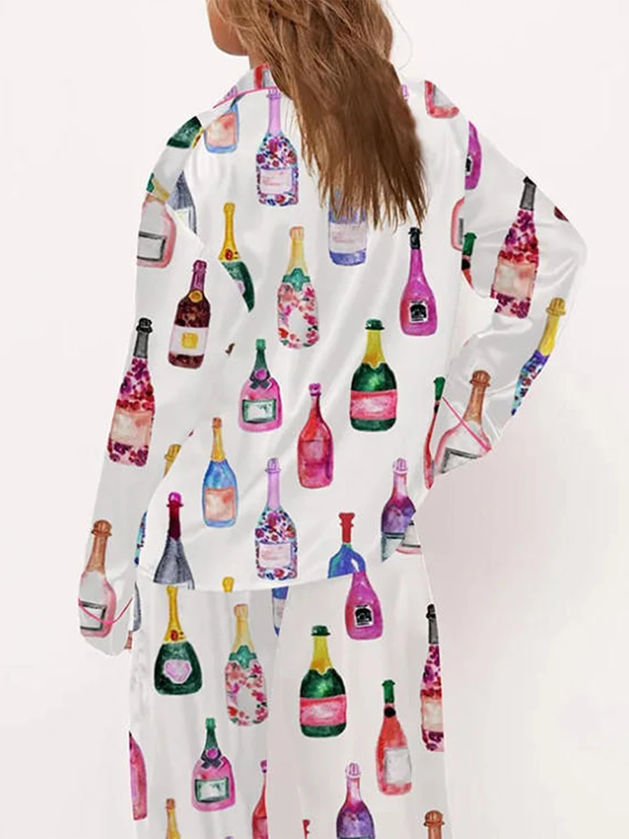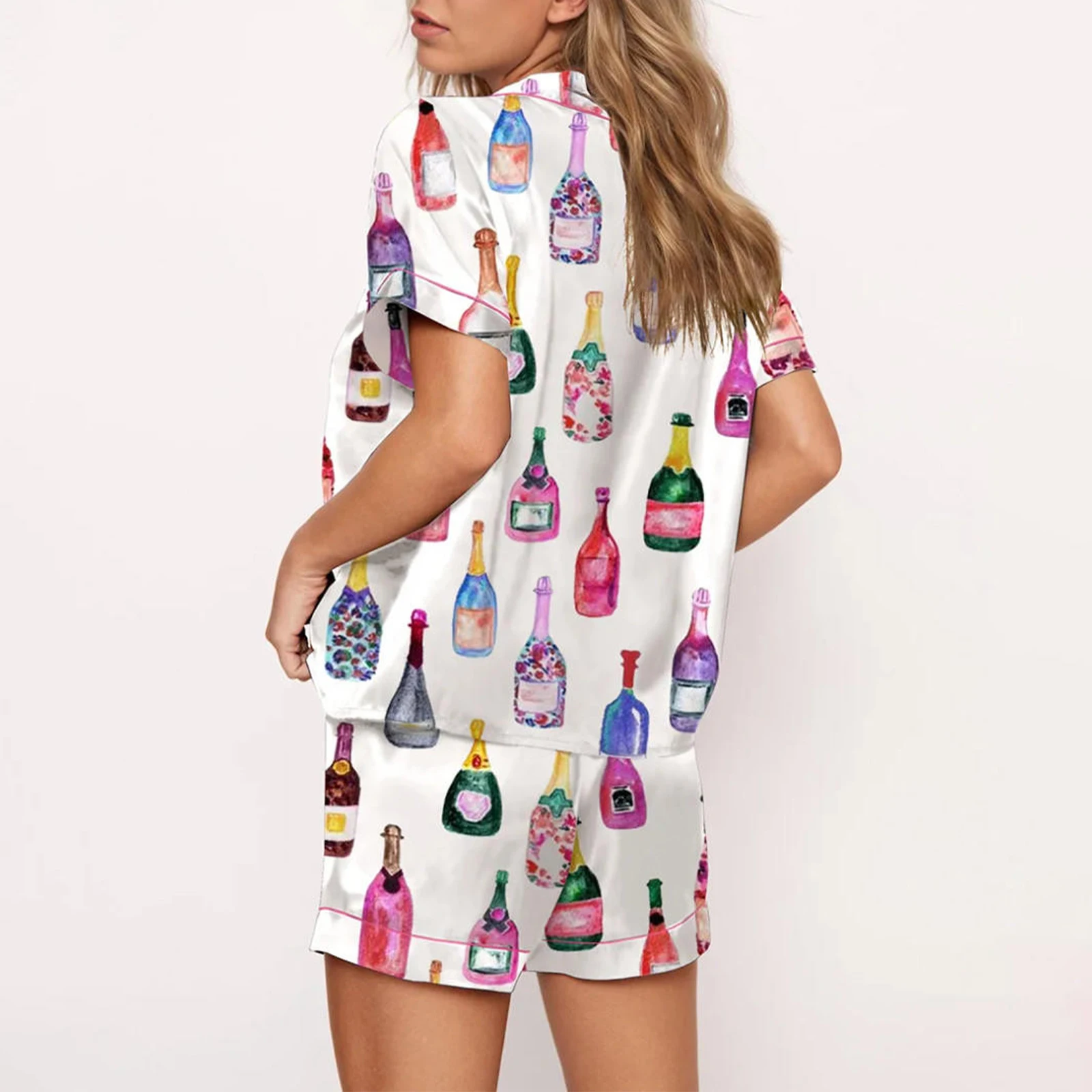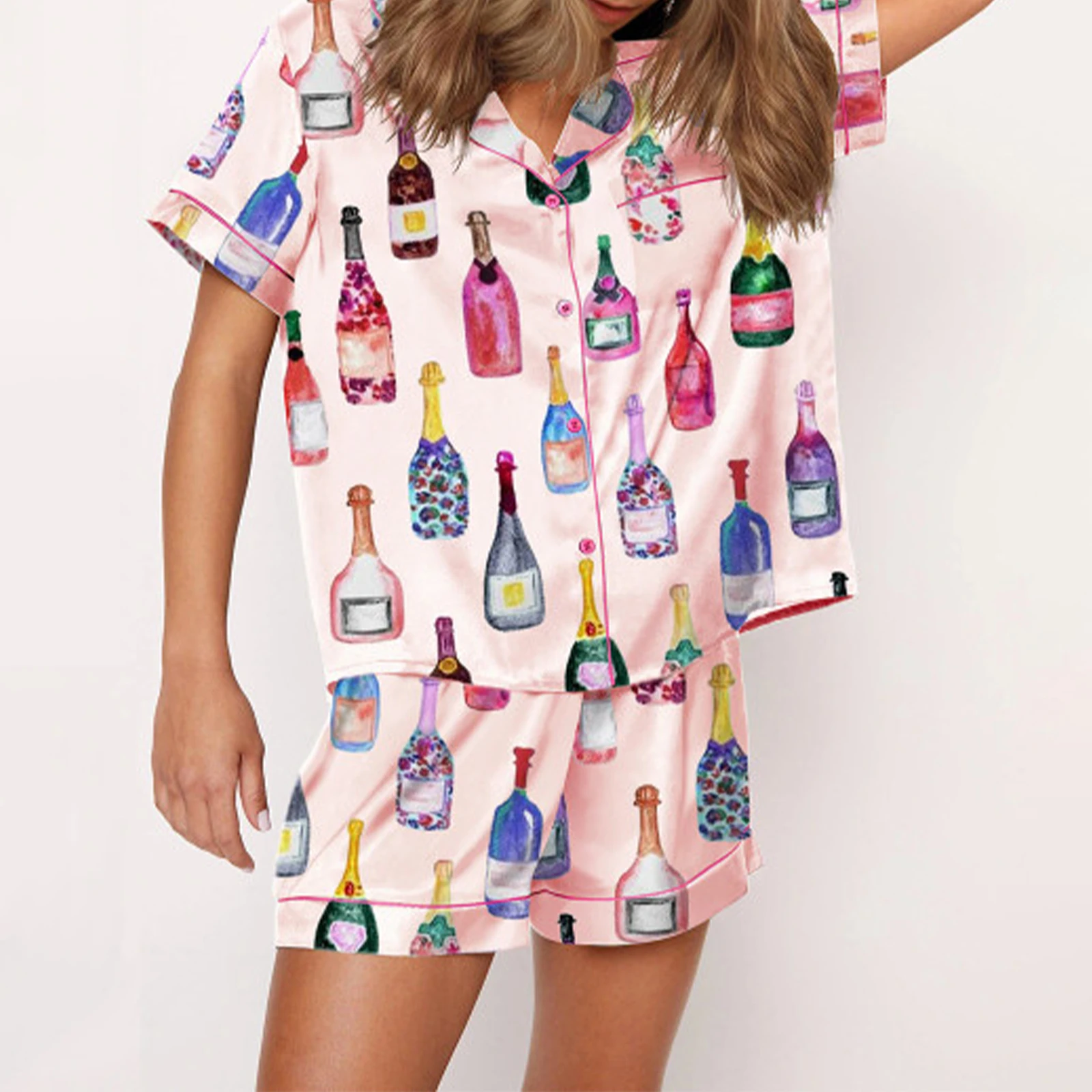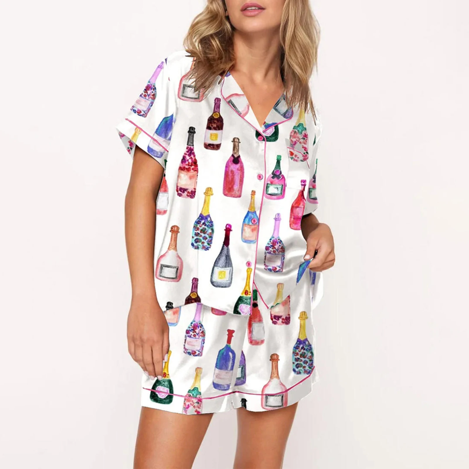 Womens 2 Piece Pajamas Set Short Sleeve Champagne Print Button Up Shirt + Shorts Set Home Clothes