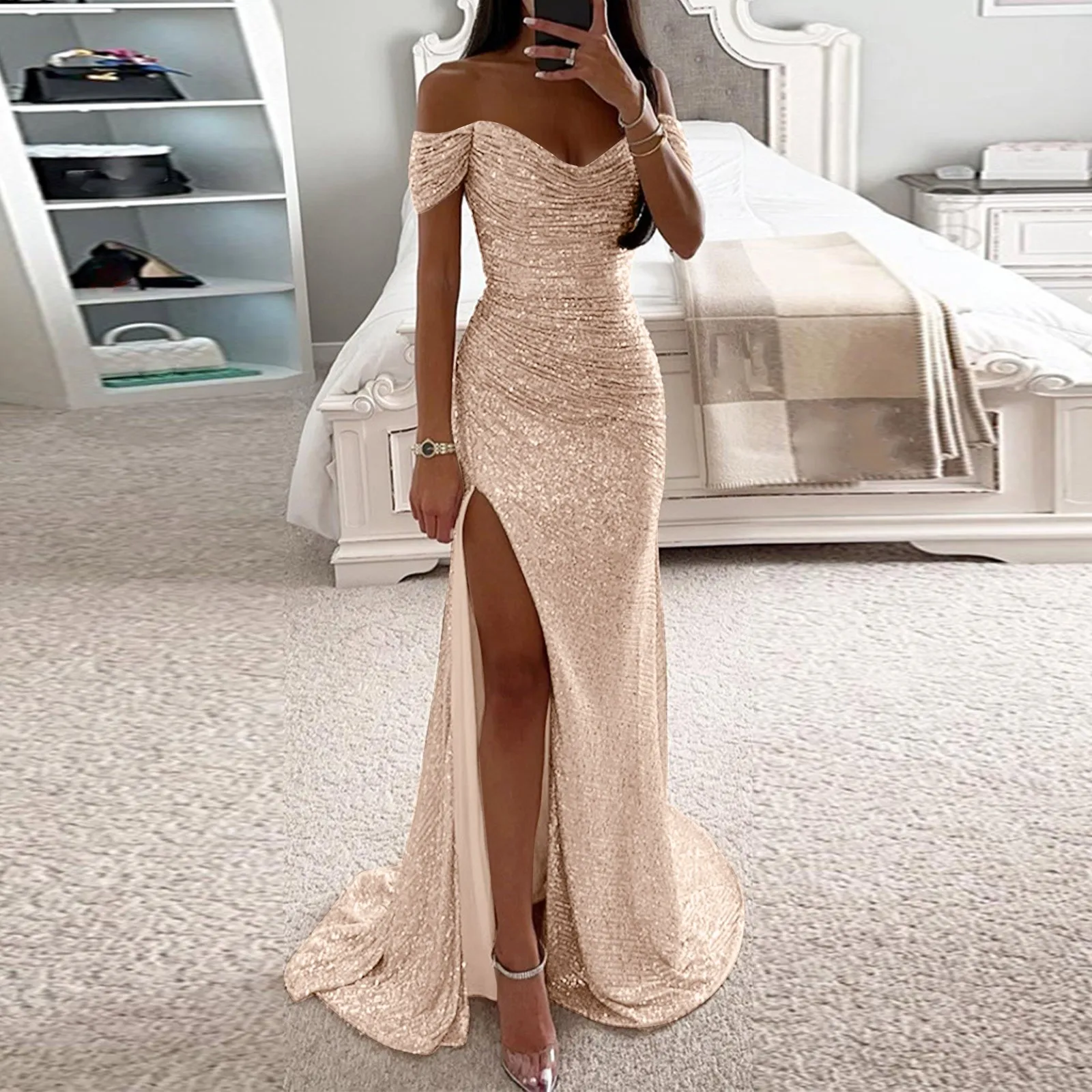 Women’s Prom Dress Party Dress Sequin Dress Maxi Dress Short Sleeve Pure Color Sequins Spring Fall Winter Off Shoulder Fashion Winter Dress Wedding Guest Evening Party Dress